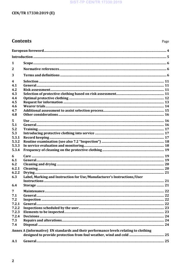 CEN/TR 17330:2019 - "Guidelines for selection, use, care and maintenance of protective clothing against foul weather, wind and cold" is a CEN Technical Report published in 2019. It provides practical guidance for employers and advisors (suppliers, PPE services, inspection and insurance bodies) to make informed decisions about selection, use, care and maintenance of protective clothing for exposure to foul weather, wind and cold. The document is aligned with European legislation (notably Regulation (EU) 2016/425 on PPE) and is intended as a Selection-Use-Care-and-Maintenance (SUCAM) guideline rather than a prescriptive standard.