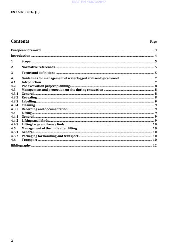 controlled reburial, in situ preservation, long term post excavation storage or excavations under water. Composite artefacts, and other waterlogged materials are specifically excluded from this standard. 2 Normative references The following documents, in whole or in part, are normatively referenced in this document and are indispensable for its application. For dated references, only the edition cited applies. For undated references, the latest edition of the referenced document (including any amendments) applies. Not applicable. 3 Terms and definitions For the purposes of this document, the following terms and definitions apply. 3.1 deposition archive formal handing over of the entire excavation record, including the conserved artefacts, to a museum or other receiving institution 3.2 block-lifting removal of a fragile find by lifting from the ground with surrounding burial matrix, with or without extra support, limiting the risk of damage 3.3 burial matrix soil, peat, sediment or other medium found in direct contact with an artefact 3.4 cleaning removal of unwanted material from an object Note 1 to entry the criteria for something being “unwanted” always have to be stated, e.g. potentially damaging, obscuring detail, un-aesthetic [SOURCE: EN 15898:2011, definition 3.5.3] 3.5 condition physical state of an object at a particular time [SOURCE: EN 15898:2011, definition 3.2.1, modified, Note 1 to entry deleted] 3.6 conservation active remedial treatment of waterlogged wooden finds designed to prevent further deterioration or degradation and bring them into a stabilized condition for research, archiving or museum display SIST EN 16873:2017