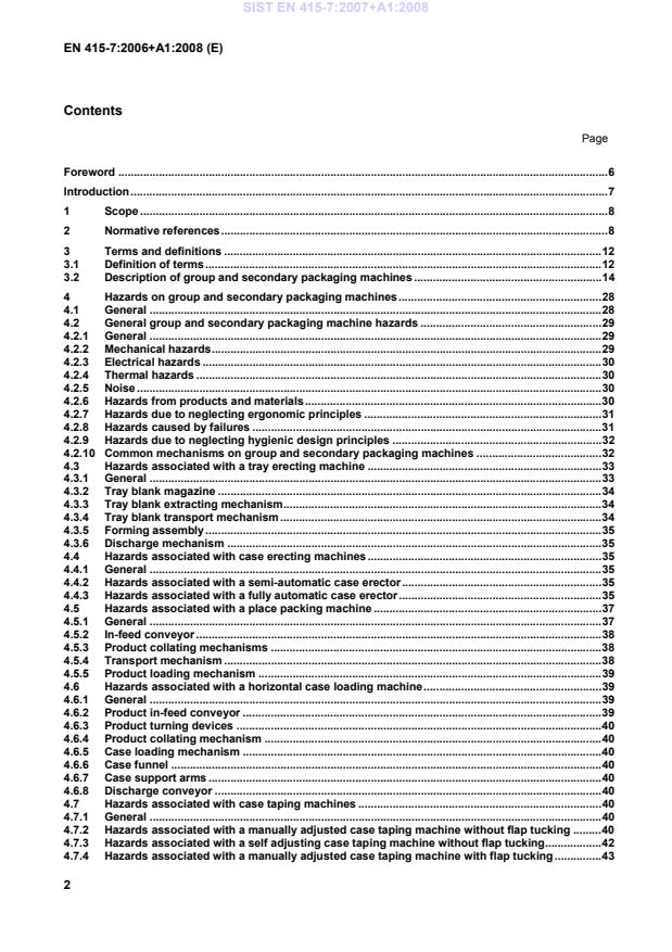 EN 415-7:2006+A1:2008 - “Safety of packaging machines - Part 7: Group and secondary packaging machines” is a CEN standard that specifies safety requirements for the design, construction, installation, commissioning, operation, adjustment, maintenance and cleaning of group and secondary packaging machines and their collating systems. It defines the scope of hazards covered (see Clause 4) and lists clear exclusions (e.g., machines made before publication, strapping machines, crate loaders/unloaders, cartoning machines). The standard does not address potentially explosive atmospheres, detailed product health/hygiene risks, electromagnetic emissions or machine decommissioning.