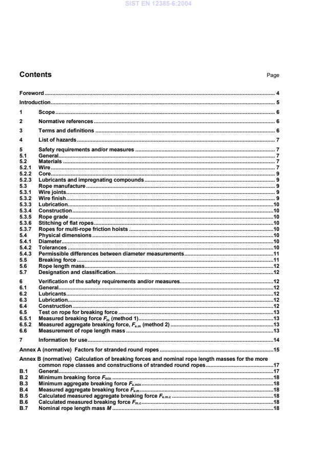 Contents Page Foreword.4 Introduction.5 1 Scope.6 2 Normative references.6 3 Terms and definitions.6 4 List of hazards.7 5 Safety requirements and/or measures.7 5.1 General.7 5.2 Materials.7 5.2.1 Wire.7 5.2.2 Core.9 5.2.3 Lubricants and impregnating compounds.9 5.3 Rope manufacture.9 5.3.1 Wire joints.9 5.3.2 Wire finish.9 5.3.3 Lubrication.10 5.3.4 Construction.10 5.3.5 Rope grade.10 5.3.6 Stitching of flat ropes.10 5.3.7 Ropes for multi-rope friction hoists.10 5.4 Physical dimensions.10 5.4.1 Diameter.10 5.4.2 Tolerances.10 5.4.3 Permissible differences between diameter measurements.11 5.5 Breaking force.11 5.6 Rope length mass.12 5.7 Designation and classification.12 6 Verification of the safety requirements and/or measures.12 6.1 General.12 6.2 Lubricants.12 6.3 Lubrication.12 6.4 Construction.12 6.5 Test on rope for breaking force.13 6.5.1 Measured breaking force Fm (method 1).13 6.5.2 Measured aggregate breaking force, Fe.m (method 2).13 6.6 Measurement of rope length mass.13 7 Information for use.14 Annex A (normative)