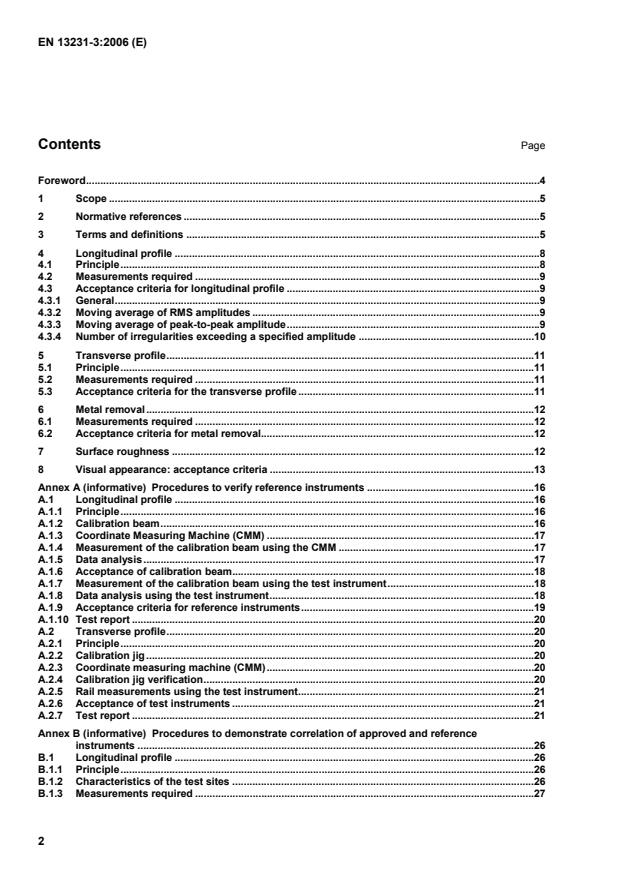 Procedures to verify reference instruments.16 A.1 Longitudinal profile.16 A.1.1 Principle.16 A.1.2 Calibration beam.16 A.1.3 Coordinate Measuring Machine (CMM).17 A.1.4 Measurement of the calibration beam using the CMM.17 A.1.5 Data analysis.17 A.1.6 Acceptance of calibration beam.18 A.1.7 Measurement of the calibration beam using the test instrument.18 A.1.8 Data analysis using the test instrument.18 A.1.9 Acceptance criteria for reference instruments.19 A.1.10 Test report.20 A.2 Transverse profile.20 A.2.1 Principle.20 A.2.2 Calibration jig.20 A.2.3 Coordinate measuring machine (CMM).20 A.2.4 Calibration jig verification.20 A.2.5 Rail measurements using the test instrument.21 A.2.6 Acceptance of test instruments.21 A.2.7 Test report.21 Annex B (informative)