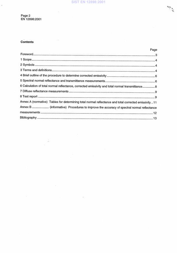 EN 12898:2001 is a standard published by the European Committee for Standardization (CEN). Its full title is "Glass in building - Determination of the emissivity". This standard covers: This draft European Standard specifies a procedure for determining the emissivity at room temperature of the surfaces of glass, coated glass and other glazing components not transparent in the far infrared. The emissivity is necessary for taking into account heat transfer by radiation from surfaces at the standard temperature of 283 K in the determination of the U value and of the total solar transmittance of glazing according to B.1 to B.5.