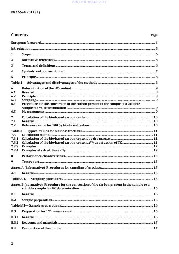Procedure for the conversion of the carbon present in the sample to a suitable sample for 14C determination . 16 B.1 General . 16 B.2 Sample preparation . 16 Table B.1— Sample preparations . 16 B.3 Preparation for 14C measurement . 16 B.3.1 General . 16 B.3.2 Reagents and materials . 17 B.4 Combustion of the sample . 17 SIST EN 16640:2017