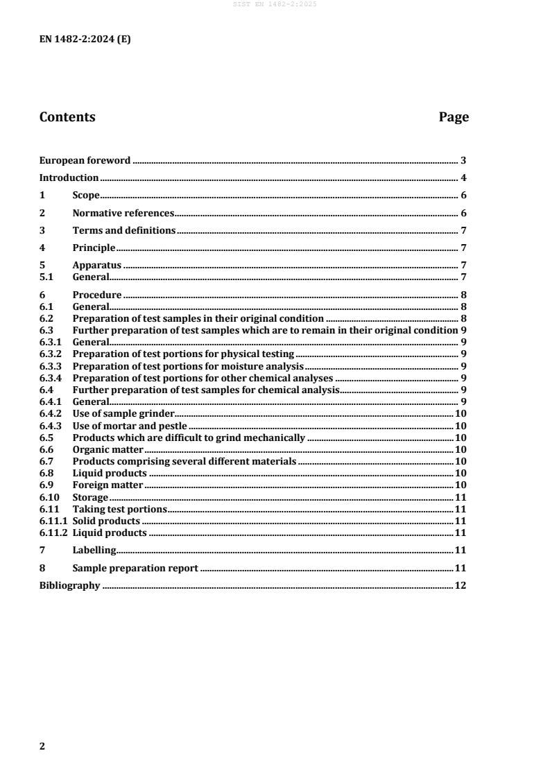 EN 1482-2:2024 - "Fertilizers, liming materials and inhibitors - Sampling and sample preparation - Part 2: General sample preparation provisions" (CEN) defines methods for reducing and preparing samples of fertilizers, liming materials, inhibitors and their blends for subsequent chemical and physical analysis. The standard sets requirements for preparing test samples and test portions from laboratory samples, describes required apparatus and handling, and requires a sample preparation report. It supersedes EN 1482-2:2007 and includes updates such as added storage requirements.