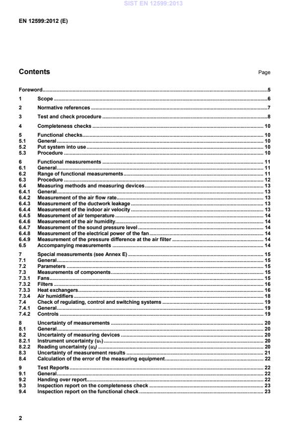 Measuring methods and measuring devices for functional measurements . 37D.1 Measurement of the air flow rate . 37D.1.1 General . 37D.1.2 Measurement in the duct cross-section . 37D.1.3 Measurement with throttle devices . 43D.1.4 Measurement in the cross-section of a chamber, the fan-casing or device . 43D.1.5 Measurement at the air terminal devices . 43D.1.6 Measuring devices (Examples) . 47D.2 Measurement of the indoor air velocity . 48D.2.1 Measuring methods . 48D.2.2 Measuring devices . 48D.3 Measurement of air temperature . 49D.3.1 Measuring methods . 49D.3.2 Measuring devices . 50D.4 Measurement of the air humidity . 50D.5 Measurement of the sound level . 51D.6 Measurement of the electrical power of the fan . 51D.6.1 Measuring method . 51D.6.2 Measuring equipment . 53D.6.3 Measuring section . 53D.6.4 Measurement uncertainties . 53D.7 Pressure difference at the air filter . 54D.8 Air leakage . 54D.8.1 Measuring method . 54SIST EN 12599:2013