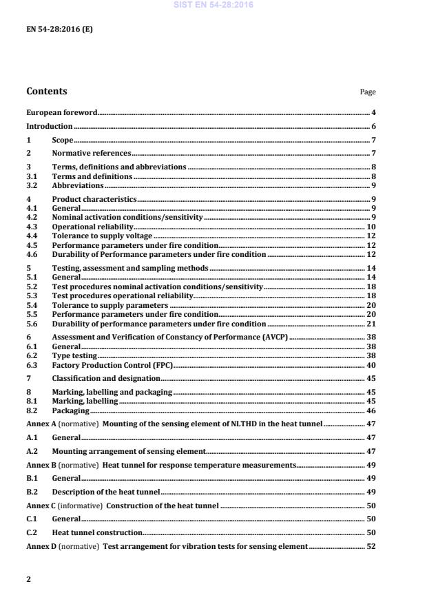 EN 54-28:2016 is a standard published by the European Committee for Standardization (CEN). Its full title is "Fire detection and fire alarm system - Part 28: Non-resettable line-type heat detectors". This standard covers: This European Standard applies to non-resettable line-type heat detectors consisting of a sensing element using an electrical sensor cable which can be connected to a sensor control unit or either directly or through an interface module to a control and indicating equipment intended for use in fire detection and fire alarm systems installed in and around buildings and civil engineering works (see EN 54 1:2011). The non-resettable sensing element has a fixed temperature alarm threshold and does not distinguish between short circuit and alarm condition. This European Standard specifies the requirements and performance criteria, the corresponding test methods and provides for the Assessment and Verification of Constancy of Performance (AVCP) of non-resettable line-type heat detectors to this European Standard. This European Standard also covers non-resettable line-type heat detectors intended for use in the local protection of plant and equipment. Non-resettable line-type heat detectors with special characteristics and developed for specific risks are not covered by this standard.