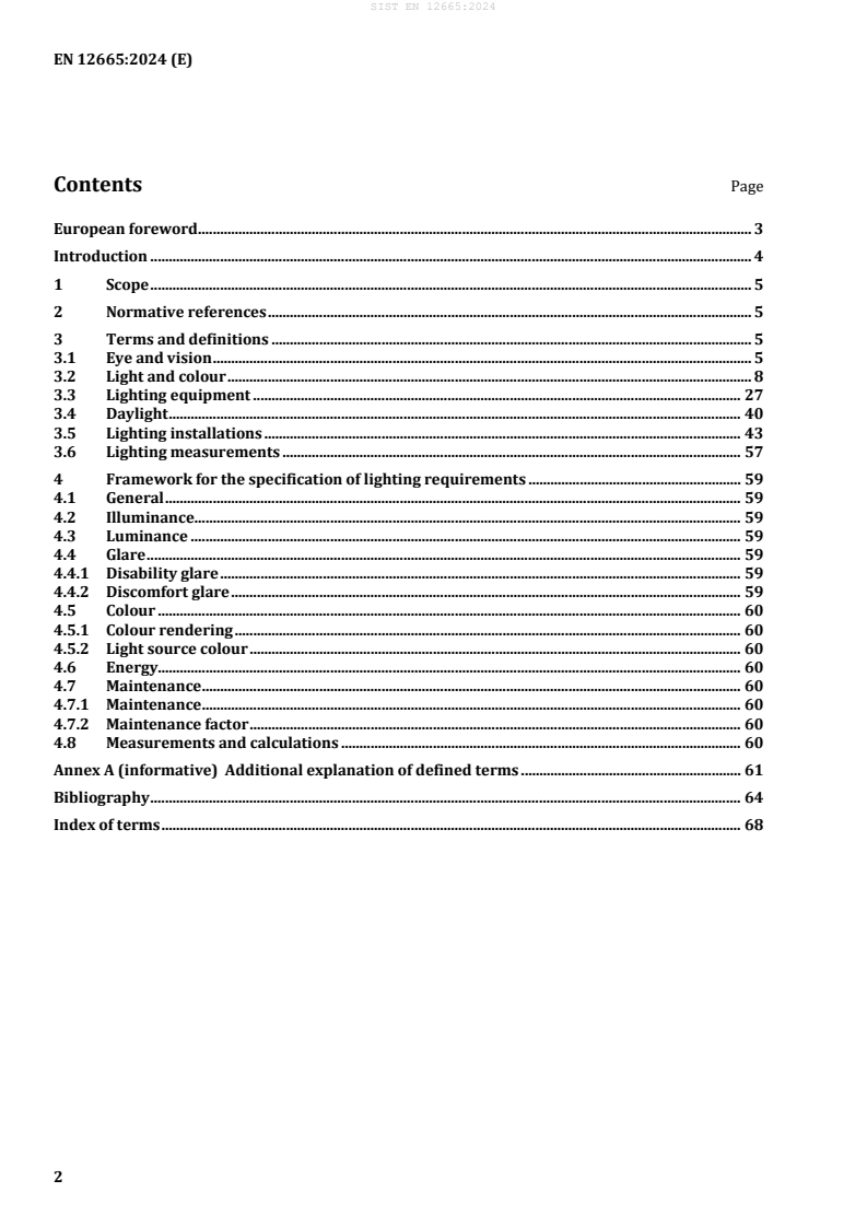 EN 12665:2024 is a standard published by the European Committee for Standardization (CEN). Its full title is "Light and lighting - Basic terms and criteria for specifying lighting requirements". This standard covers: This document defines basic terms and definitions for use in all lighting applications. This document also sets out a framework for the specification of lighting requirements, giving details of aspects that are to be considered when setting those requirements.