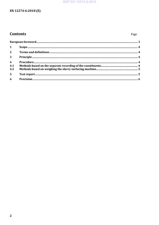 EN 12274-6:2018 is a CEN European Standard that defines test methods to determine the average rate of application of slurry surfacing in kilograms per square metre (kg/m2). It applies to slurry surfacing used on roads, airfields and other trafficked areas and is part of the EN 12274 series covering sampling, composition and performance tests for cold-laid bituminous surfacings.