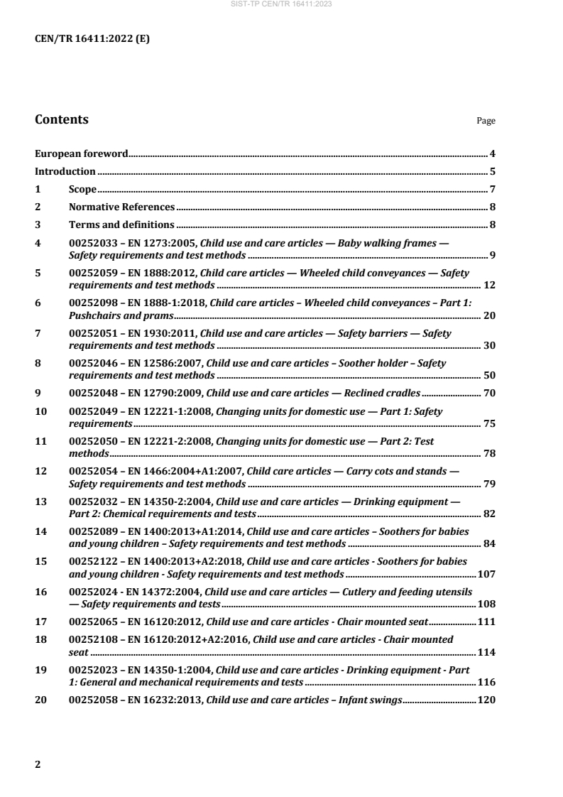 The purpose of this CEN Technical Report is to provide replies to requests for interpretations and clarifications of: — EN 1273:2005, Child use and care articles — Baby walking frames — Safety requirements and test methods; — EN 1888:2012, Child care articles — Wheeled child conveyances — Safety requirements and test methods; — EN 1888-1:2018, Child care articles - Wheeled child conveyances - Part 1: Pushchairs and prams; — EN 1930:2011, Child use and care articles — Safety barriers — Safety requirements and test methods; — EN 12586:2007, Child use and care articles — Soother holder — Safety requirements and test methods; — EN 12790:2009, Child use and care articles — Reclined cradles; — EN 12221 1:2008, Changing units for domestic use — Part 1: Safety requirements; — EN 12221 2:2008, Changing units for domestic use — Part 2: Test methods; — EN 1466:2004+A1:2007, Child care articles — Carry cots and stands — Safety requirements and test methods; — EN 14350 2:2004, Child use and care articles — Drinking equipment — Part 2: Chemical requirements and tests; — EN 1400:2013+A1:2014, Child use and care articles — Soothers for babies and young children; — EN 14372:2004, Child use and care articles — Cutlery and feeding utensils — Safety requirements and tests; — EN 16120:2012, Child use and care articles — Chair mounted seat; — EN 16120:2012+A2:2016, Child use and care articles — Chair mounted seat; — EN 14350-1:2004, Child use and care articles — Drinking equipment - Part 1: General and mechanical requirements and tests; — EN 16232:2013, Child use and care articles — Infant swings. — EN 17022:2018, Child care articles - Bathing aids - Safety requirements and test methods; — EN 17072:2018, Child care articles - Bath tubs, stands and non-standalone bathing aids - Safety requirements and test methods; — EN 12586:2007+A1:2011, Child care articles - Soother holder – Safety requirements and test methods; — EN 14350:2020, Child care articles – Drinking equipment - Safety requirements and test methods; — EN 13209-1:2004, Child use and care articles - Baby carriers - Safety requirements and test methods - Part 1: Framed back carriers; — EN 13209-1:2021, Child care articles - Child carriers - Safety requirements and test methods - Part 1: Framed back carrier.