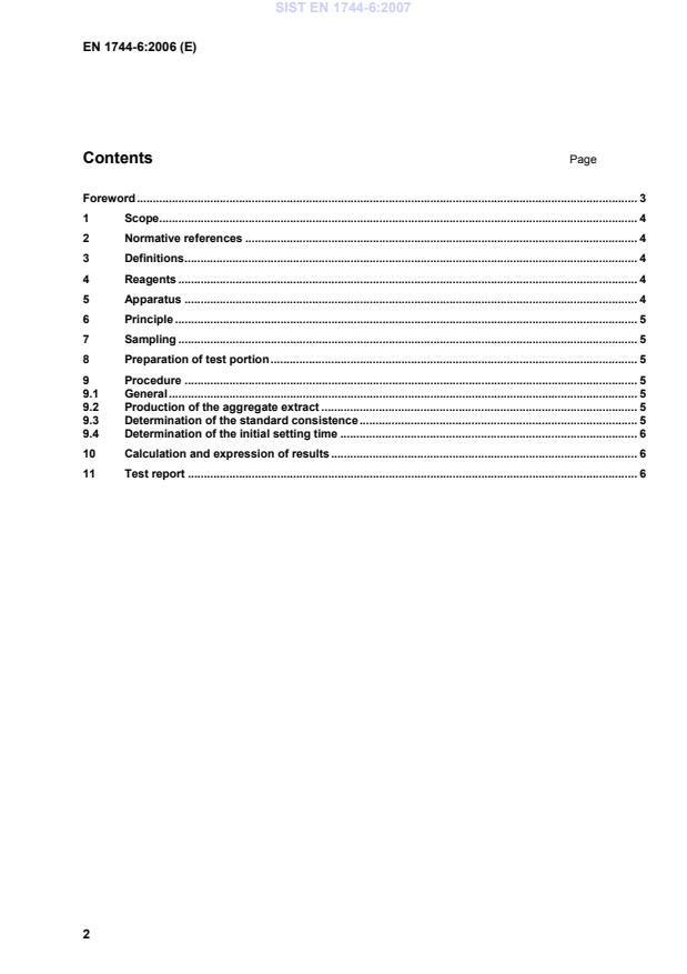 EN 1744-6:2006 is a standard published by the European Committee for Standardization (CEN). Its full title is "Tests for chemical properties of aggregates - Part 6: Determination of the influence of recycled aggregate extract on the initial setting time of cement". This standard covers: This European Standard specifies the procedure for the determination of the influence of water-soluble components from recycled aggregates on the initial setting time of cement. NOTE A procedure is described in EN 1744-1:1998, clause 15.3, for use with natural aggregates; this procedure is intended to demonstrate and quantify the effects of organic contaminators. It is not suitable for recycled aggregates because these may also contain inorganic contaminators.
