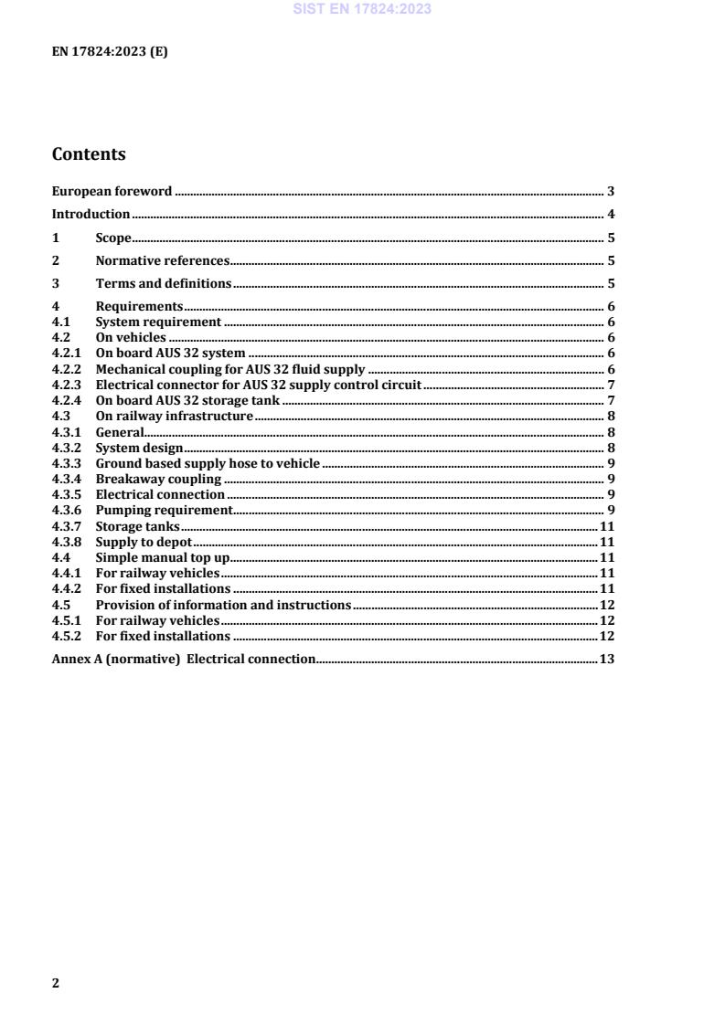 EN 17824:2023 is a standard published by the European Committee for Standardization (CEN). Its full title is "Railway applications - Ground based services - Exhaust treatment fluid (AUS 32) refilling equipment". This standard covers: This European Standard specifies interface requirements on vehicles and on ground based refilling and storage equipment for any railway vehicle fitted with internal combustion engine (s) requiring a NOx reduction agent AUS 32 (32 % aqueous urea solution) as specified in ISO 22241-1. It is also applicable to mobile or temporary refilling points for AUS 32.