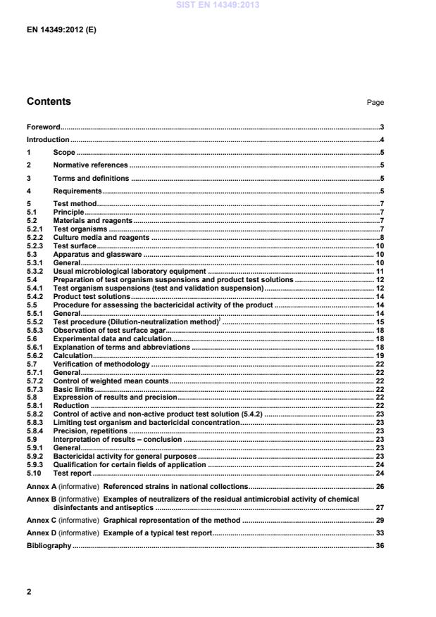 This European Standard applies to products that are used in the veterinary area on non-porous surfaces without mechanical action i.e. in the breeding, husbandry, production, transport and disposal of all animals except when in the food chain following death and entry to the processing industry. EN 14885 specifies in detail the relationship of the various tests to one another and to “use recommendations”. NOTE 1 The method described is intended to determine the activity of commercial formulations or active substances under the conditions in which they are used. NOTE 2 This method corresponds to a Phase 2 Step 2 test. This method cannot be used to evaluate the activity of products against mycobacteria. 2 Normative references The following documents, in whole or in part, are normatively referenced in this document and are indispensable for its application. For dated references, only the edition cited applies. For undated references, the latest edition of the referenced document (including any amendments) applies. EN 12353, Chemical disinfectants and antiseptics — Preservation of test organisms used for the determination of bactericidal, mycobactericidal, sporicidal and fungicidal activity EN 14885, Chemical disinfectants and antiseptics — Application of European Standards for chemical disinfectants and antiseptics 3 Terms and definitions For the purposes of this document, the terms and definitions given in EN 14885 apply. 4 Requirements The product shall demonstrate at least a 4 decimal log (lg) reduction from a water control, when tested in accordance with Table 1 and Clause 5 under simulated low level (3,0 g/l bovine albumin) or high level soiling (10 g/l yeast extract and 10 g/l bovine albumin) on a surface. SIST EN 14349:2013