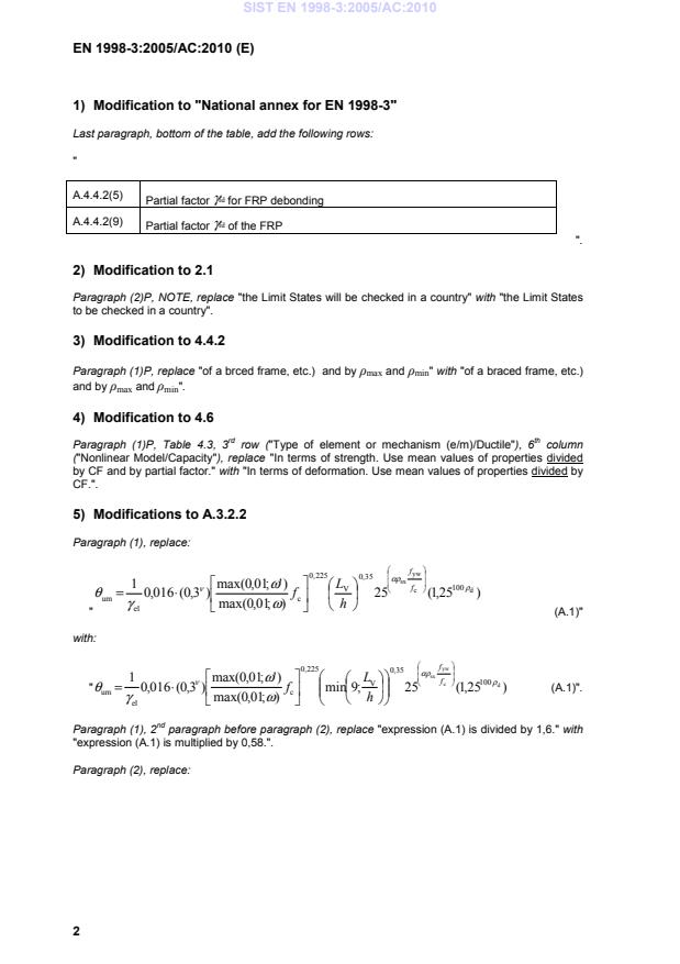 and by max and min" with "of a braced frame, etc.) and by max and min". 4) Modification to 4.6 Paragraph (1)P, Table 4.3, 3rd row ("Type of element or mechanism (e/m)/Ductile"), 6th column ("Nonlinear Model/Capacity"), replace "In terms of strength. Use mean values of properties divided by CF and by partial factor." with "In terms of deformation. Use mean values of properties divided by CF.". 5) Modifications to A.3.2.2 Paragraph (1), replace: ")25,1(25);01,0(max)';01,0(max)3,0(016,01dcywsx10035,0V225,0celumραρνωωγθ⋅=ffhLf (A.1)" with: ")25,1(25;9min);01,0(max)';01,0(max)3,0(016,01dcywsx10035,0V225,0celumραρνωωγθ⋅=ffhLf (A.1)". Paragraph (1), 2nd paragraph before paragraph (2), replace "expression (A.1) is divided by 1,6." with "expression (A.1) is multiplied by 0,58.". Paragraph (2), replace: SIST EN 1998-3:2005/AC:2010