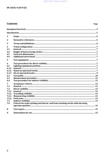 Ta standard določa zahteve in preskusne postopke za 360-stopinjsko vidno polje voznika pri tovornih in tristranih viličarjih z dvižnim položajem upravljavca s sedečim ali stoječim upravljavcem v skladu s standardom ISO 5053 -1 ter je predviden za uporabo skupaj s standardom EN 16842-1. Ta standard se ne uporablja za: – vožnjo z dvižnim položajem upravljavca nad 500 mm. Posebne zahteve iz standarda EN 16842-9 imajo prednost pred splošnimi zahtevami iz standarda EN 16842-1.