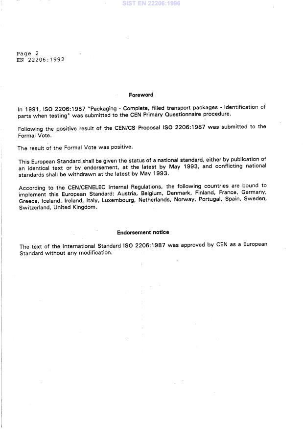 EN 22206:1992 is a standard published by the European Committee for Standardization (CEN). Its full title is "Packaging - Complete, filled transport packages - Identification of parts when testing (ISO 2206:1987)". This standard covers: The system for identifying is specified for parallelepipedal and cylindrical packages, sacks and bags, also for miscellaneous packages. Three figures show the numbering of the surfaces, edges and corners.