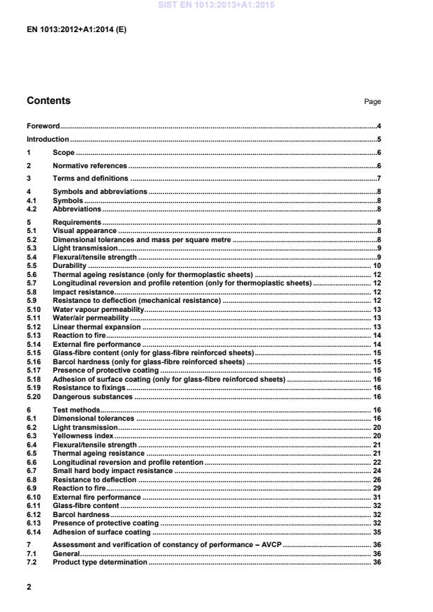 4 Symbols and abbreviations 4.1 Symbols An class for the exposure to artificial accelerated weathering using xenon-arc lamps Bn class for the exposure to artificial accelerated weathering using fluorescent UV lamps H radiant exposure YI yellowness index of a test specimen exposed to ageing YI0 yellowness index of a test specimen unexposed to ageing ûYI change of the yellowness index after ageing 4.2 Abbreviations FPC factory production control GRA glass-fibre reinforced acrylic (PMMA) GRP glass-fibre reinforced polyester ITT initial type testing PC polycarbonate PET poly(ethylene terephthalate) PMMA poly(methyl methacrylate) PVC-U unplasticised poly(vinyl chloride) PVF poly(vinyl fluoride) 5 Requirements 5.1 Visual appearance Both sides of the sheets shall be of regular appearance. Visual or tactile examination shall reveal no evidence of any hole, cracking or splitting, and no cluster of bubbles greater than 1 mm in diameter, or inclusions that are likely to affect properties. For GRP sheets, any defects such as resin ribs, glass folds or glass knots shall not exceed 5 mm in diameter. The edges of the sheet shall be straight and clean. Further requirements concerning the visual aspects of the sheets can be agreed upon between the manufacturer and the customer. Where required, the sheet shall be declared as “diffusing” or “non-diffusing” depending on whether the image of an object placed 1 m behind the sheet appears blurred or sharp, respectively. 5.2 Dimensional tolerances and mass per square metre The dimensional tolerances and mass per square metre shall be assessed when subject to regulatory requirement. When measured in accordance with the test methods as specified in 6.1.1 to 6.1.3 and Table 1, the dimensional tolerances and mass per square metre of the sheets shall conform to the requirements given in Table 1. SIST EN 1013:2013+A1:2015