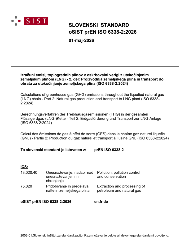 Izračuni emisij toplogrednih plinov v oskrbovalni verigi z utekočinjenim zemeljskim plinom (LNG) - 2. del: Proizvodnja zemeljskega plina in transport do obrata za utekočinjanje zemeljskega plina (ISO 6338-2:2024)