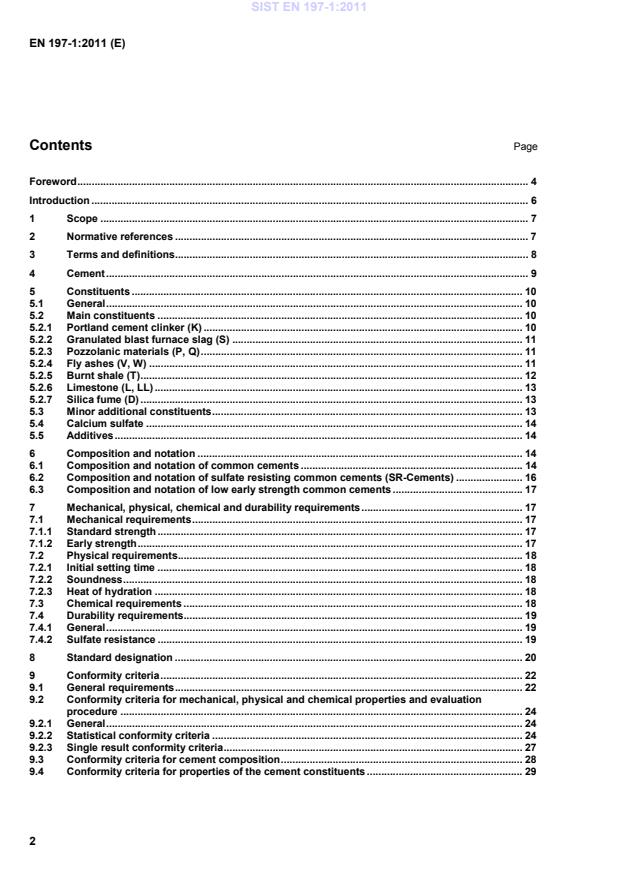 Ta evropski standard določa in postavlja zahteve za 27 različnih običajnih cementov, 7 sulfatnoodpornih običajnih cementov, prav tako pa tudi za 3 različne žlindrine cemente z nizko zgodnjo trdnostjo in 2 žlindrina sulfatnoodporna cementa z nizko zgodnjo trdnostjo ter njihove sestavine. Definicija vsakega cementa vključuje deleže, v katerih je treba sestavine mešati, da bi se proizvedli ti različni proizvodi, ki obsegajo devet trdnostnih razredov. Definicija vključuje tudi zahteve, katerim morajo ustrezati sestavine. Vključuje tudi mehanske, fizikalne in kemijske zahteve. Nadalje ta standard določa tudi merila skladnosti in s tem povezana pravila. Podane so tudi potrebne zahteve za trajnost. Poleg sulfatnoodpornih cementov, opredeljenih v tem dokumentu, so kot odporni proti sulfatni agresiji potrjeni na nacionalni ravni še drugi cementi, ki so skladni bodisi s tem standardom ali z drugimi standardi, evropskimi ali nacionalnimi. Cementi, navedeni v dodatku A, so po mnenju predstavnikov CEN iz različnih držav sulfatno odporni z omejitvami glede na mesto uporabe. OPOMBA 1: Poleg predpisanih zahtev je pomembna tudi izmenjava dodatnih informacij med proizvajalcem cementa in uporabnikom. Postopki za takšno izmenjavo v tem standardu niso obravnavani, temveč naj bi bili obravnavani skladno z nacionalnimi standardi ali predpisi, lahko pa se zanje dogovorita zainteresirani stranki.