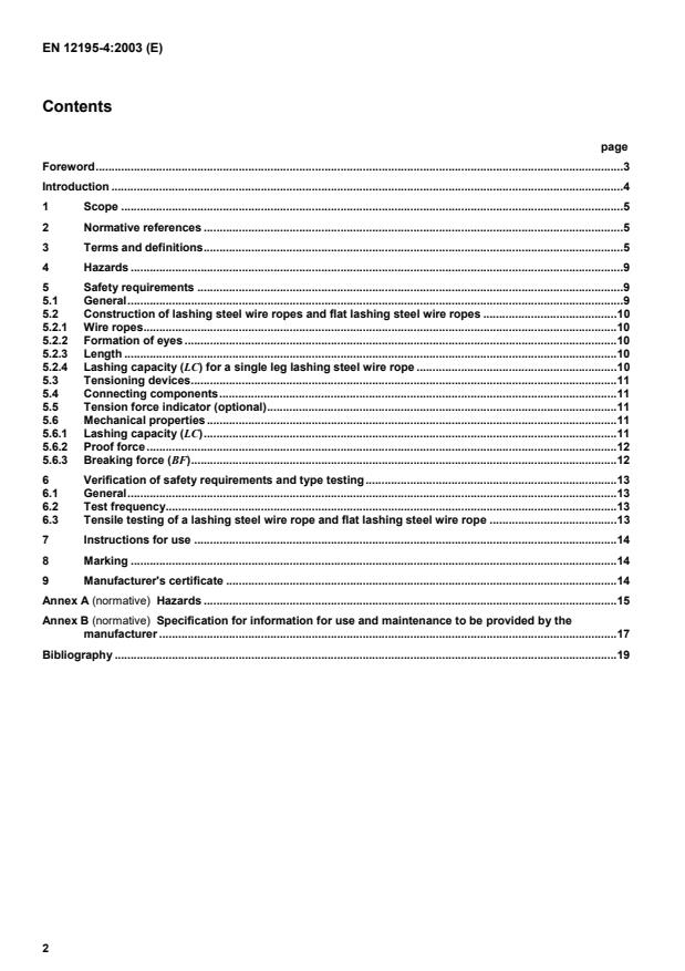 EN 12195-4:2003 is a standard published by the European Committee for Standardization (CEN). Its full title is "Load restraint assemblies on road vehicles - Safety - Part 4: Lashing steel wire ropes". This standard covers: This Part 4 of EN 12195 - specifies safety requirements for lashing steel wire ropes and flat lashing steel wire ropes and lashing combina-tions with lashing steel wire ropes for the safe surface transport of loads on load carriers, e. g. trucks and trailers which are used on roads or located on vessels or on rail waggons and/or combinations thereof; - stipulates procedures for testing lashing steel wire ropes and flat lashing steel wire ropes; - deals with hazards which could occur when lashing steel wire ropes and flat lashing steel wire ropes are in use as intended and under conditions foreseen by the manufacturer (see clause 4 and Annex A).