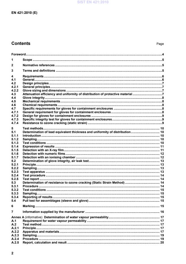 Determination of water vapour permeability . 17A.1 Requirement for water vapour permeability . 17A.2 Test method . 17A.2.1 Principle . 17A.2.2 Apparatus and materials . 17A.2.3 Sampling . 19A.2.4 Procedure . 19A.2.5 Report, calculation and result . 20SIST EN 421:2010