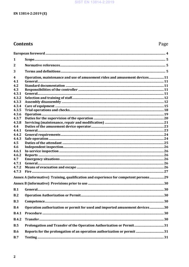 EN 13814-2:2019 is a standard published by the European Committee for Standardization (CEN). Its full title is "Safety of amusement rides and amusement devices - Part 2: Operation, maintenance and use". This standard covers: This document specifies the minimum requirements necessary to ensure the safe maintenance, operation, inspection and testing of amusement ride and amusement devices which are intended to be installed both repeatedly without degradation or loss of integrity, and temporarily or permanently in fairgrounds and amusement parks or any other locations. Grandstands, construction site installations, scaffolding, removable agricultural structures, simple coin operated children's amusement devices, carrying up to three children, and recreational devices like waterslides or summer toboggan runs, playground equipment, rope courses, climbing wall, inflatable, trampolines, swimming pool equipment (this list is not exhaustive) are not covered by this document. In terms of workers’ health and safety, national regulations apply.