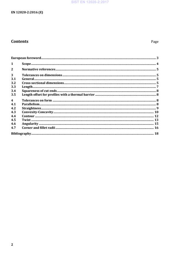 European foreword . 3 1 Scope . 4 2 Normative references . 5 3 Tolerances on dimensions . 5 3.1 General . 5 3.2 Cross-sectional dimensions . 5 3.3 Length . 7 3.4 Squareness of cut ends . 8 3.5 Length offset for profiles with a thermal barrier . 8 4 Tolerances on form . 8 4.1 Parallelism . 8 4.2 Straightness . 9 4.3 Convexity-Concavity . 10 4.4 Contour . 12 4.5 Twist . 13 4.6 Angularity . 15 4.7 Corner and fillet radii . 16 Bibliography . 18