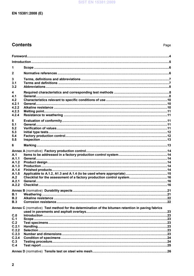 The intended use of these geotextiles and geotextile-related products is to fulfil one or more of the following functions: reinforcement, stress relief and barrier. The use of geotextiles and geotextile-related products is to be considered as a part of an interlayer and asphalt overlay system. This standard is not applicable to geosynthetic barriers, as defined in EN ISO 10318. This standard provides for evaluation of conformity of the product to this European Standard and for factory production control procedures. This standard defines requirements to be met by manufacturers and distributors with regard to the presentation of product properties. NOTE 1 Particular application cases or national specifications may contain additional requirements regarding product application or installation and specifying preferably standardized test methods, if they are technically relevant and not conflicting with European Standards. 2 Normative references The following referenced documents are indispensable for the application of this document. For dated references, only the edition cited applies. For undated references, the latest edition of the referenced document (including any amendments) applies. EN 1426, Bitumen and bituminous binders – Determination of needle penetration EN 10002-1, Metallic materials – Tensile testing – Part 1: Method of test at ambient temperature EN 10080, Steel for the reinforcement of concrete – Weldable reinforcing steel – General EN 10223-3, Steel wire and wire products for fences – Part 3: Hexagonal steel wire netting for engineering purposes EN 10244-2, Steel wire and wire products – Non ferrous metallic coatings on steel wire – Part 2: Zinc or zinc alloy coatings prEN 10348, Steel for the reinforcement of concrete – Galvanized reinforcing steel EN 12224, Geotextiles and geotextile-related products – Determination of the resistance to weathering EN 14030, Geotextiles and geotextile-related products – Screening test method for determining the resistance to acid and alkaline liquids (ISO/TR 12960:1998, modified) EN ISO 1043-1:2001, Plastics – Symbols and abbreviated terms – Part 1: Basic polymers and their special characteristics (ISO 1043-1:2001) EN ISO 3146, Plastics –– Determination of melting behaviour (melting temperature or melting range) of semi-crystalline polymers by capillary tube and polarizing-microscope methods (ISO 3146:2000) EN ISO 9862, Geosynthetics – Sampling and preparation of test specimens (ISO 9862:2005) EN ISO 10318:2005, Geosynthetics – Terms and definitions (ISO 10318:2005) SIST EN 15381:2009