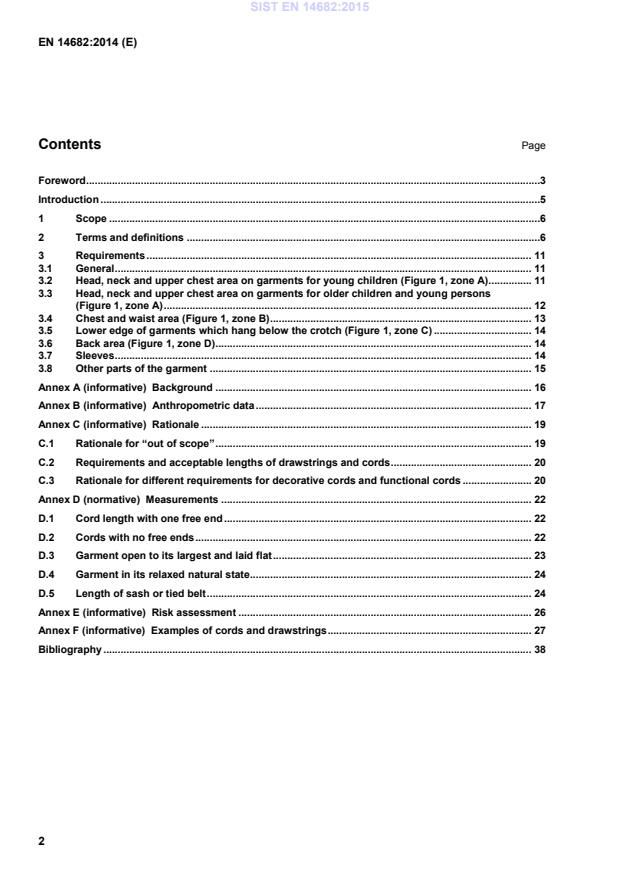 3.4 has been revised. Examination of garments shows that those clothes that are worn from waist down can be defined as those that fit closely to the body to be functional. Strings at the waist on these garments when closed to the body will be low hazard, and some requirements have been relaxed. Other garments can be more flowing, for example unbuttoned coats. In these garments, requirements have been strengthened. d) 3.7 sleeves: The original text assumed strings protruded from lower hems only, and that sleeves were long or short. This did not reflect fashion. Clauses have been revised to consider strings other than at hems, and all lengths of sleeve e) Annex B: new paragraph to clarify that anthropometric data listed is that used to define children’s sizes in EN 14682:2014, where the tallest children in Europe were considered. f) Annex C: enhanced to provide rationale for exclusions from scope, and rationale for requirements for lengths of drawstrings and cords. Explanation that manufacturers need to be more aware of how product is likely to be used, and not what it is called as a garment type. g) Annex D, new improved methods for measurement of — sash or tied belt, — garment open to its largest and laid flat, — garment in its relaxed natural state. h) Annex F, improved figures provided to illustrate requirements. i) To assist the reader, throughout this European Standard, the terms defined in Clause 2 'Terms and definitions' are in italics. This document has been prepared under a mandate given to CEN by the European Commission and the European Free Trade Association. According to the CEN-CENELEC Internal Regulations, the national standards organizations of the following countries are bound to implement this European Standard: Austria, Belgium, Bulgaria, Croatia, Cyprus, Czech Republic, Denmark, Estonia, Finland, Former Yugoslav Republic of Macedonia, France, Germany, Greece, Hungary, Iceland, Ireland, Italy, Latvia, Lithuania, Luxembourg, Malta, Netherlands, Norway, Poland, Portugal, Romania, Slovakia, Slovenia, Spain, Sweden, Switzerland, Turkey and the United Kingdom. SIST EN 14682:2015