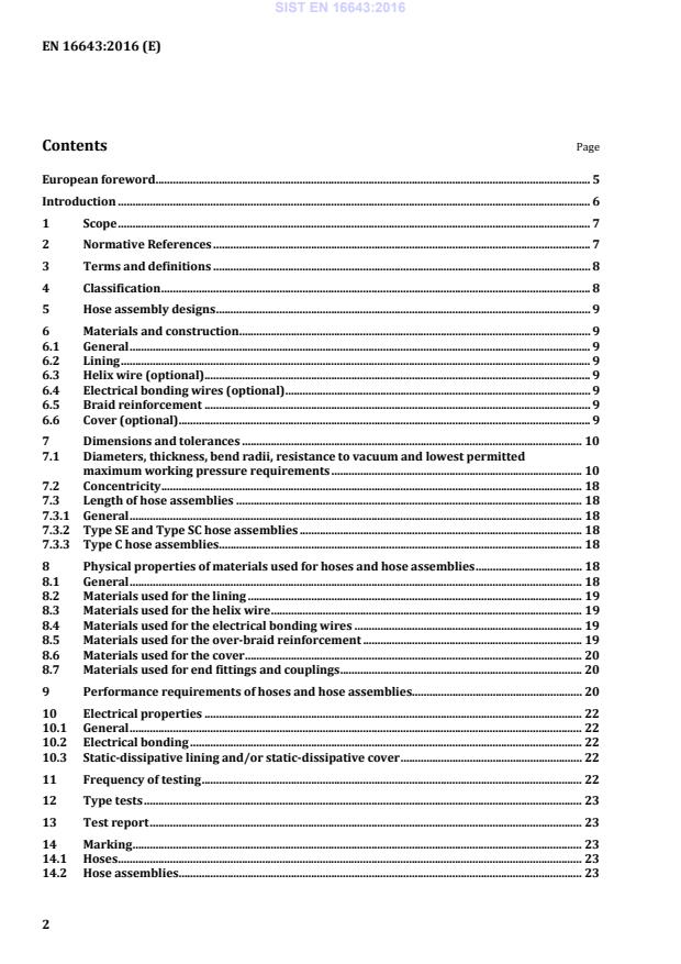 Tables Table 1 — Dimension requirements, Type SE lining hoses without and with cover . 11 Table 2 — Maximum working pressure requirements, Type SE lining hoses without and with cover for two typical braid reinforcements . 12 Table 3 — Dimension requirements, Type SC lining hoses without and with cover . 13 Table 4 — Maximum working pressure requirements, Type SC lining hoses without and with cover for three typical braid reinforcements . 14 Table 5 — Dimension requirements for manufacturing method 1, Type C lining hoses without and with cover . 15 Table 6 — Dimension requirements for manufacturing method 2, Type C lining hoses without and with cover . 16 SIST EN 16643:2016