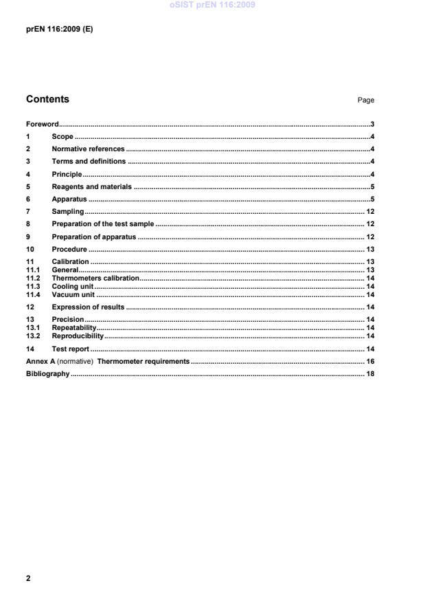 prEN 116 is a draft published by the European Committee for Standardization (CEN). Its full title is "Diesel and domestic heating fuels - Determination of cold filter plugging point". This standard covers: This European Standard specifies a method for the determination of the cold filter plugging point (CFPP) of diesel and domestic heating fuels. This European Standard is applicable to distillate fuels, including those containing a flow-improving or other additive, intended for use in diesel engines and domestic heating installations. The results obtained from the method specified in this European Standard are suitable for estimating the lowest temperature at which a fuel will give trouble-free flow in the fuel system. NOTE In the case of diesel fuels the results are usually close to the temperature of failure in service except when the fuel system contains, for example, a paper filter installed in a location exposed to the weather or if the filter plugging temperature is more than 12 °C below the cloud point of the fuel. Domestic heating installations are usually less critical and often operate satisfactorily at temperatures somewhat lower than those indicated by the test results. WARNING The use of this standard may involve hazardous materials, operations and equipment. This standard does not purport to address all of the safety problems associated with its use. It is the responsibility of the user of this standard to establish appropriate safety and health practices and determine the applicability of regulatory limitations prior to use.