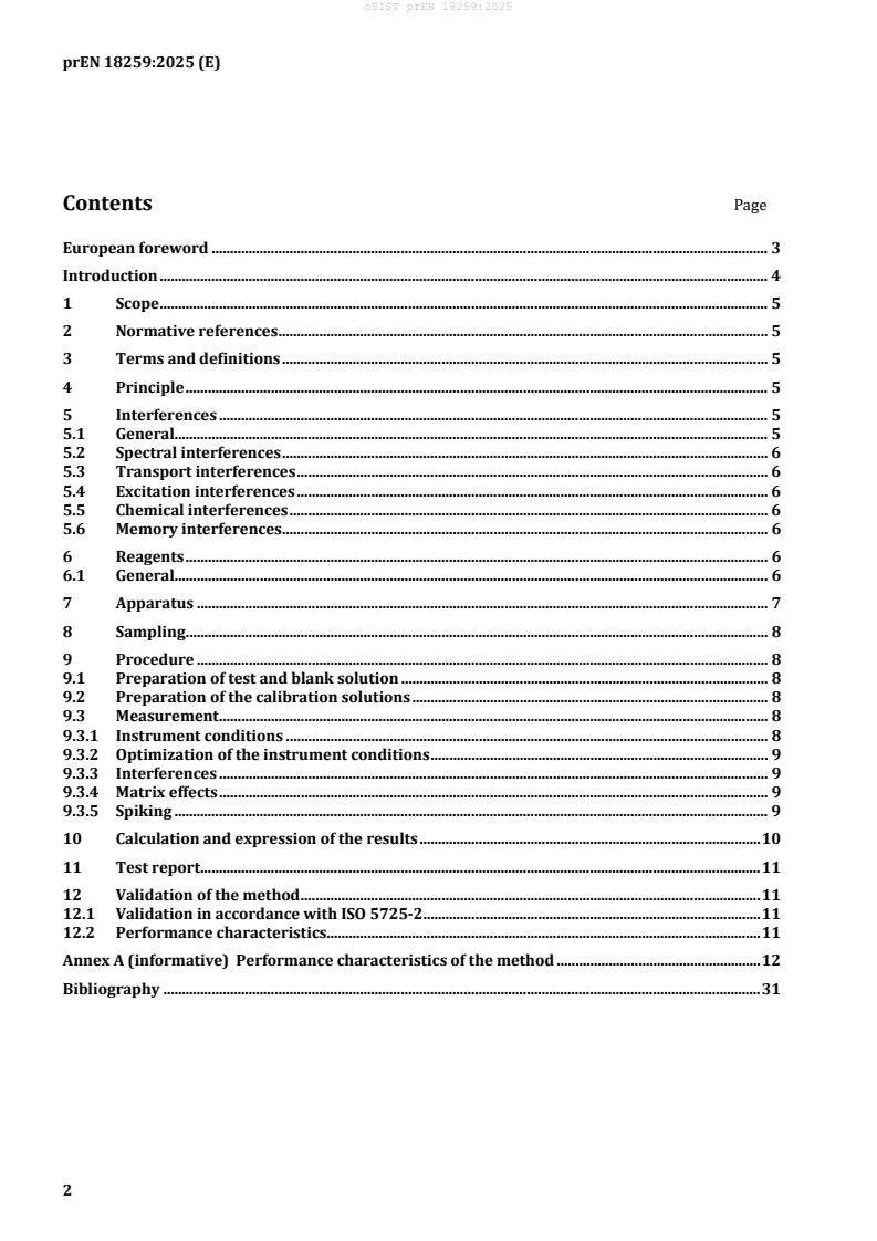 prEN 18259 is a draft published by the European Committee for Standardization (CEN). Its full title is "Soil improvers and growing media - Determination of aqua regia soluble elements". This standard covers: This document specifies a method for the determination of elements in soil improvers or growing media extracts using inductively coupled plasmaatomic emission spectrometry (ICPAES) NOTE 1 Alternatively, other suitable analytical techniques, e.g. inductively coupled plasma mass spectrometry (ICPMS) or atomic absorption spectrometry (AAS), can be used for the measurement if the user proves that the method gives the same results. This method is applicable to aqua regia extracts prepared according to EN 13650:— 1. NOTE 2 The method may be used for the determination of other elements, provided the user has verified the applicability.