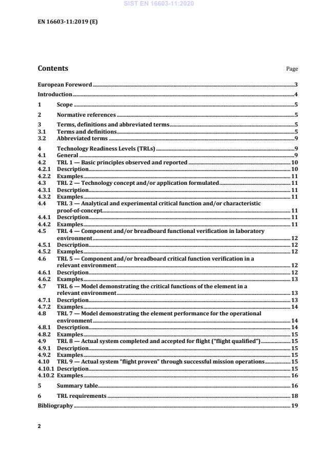 EN 16603-11:2019 - "Space engineering - Definition of the Technology Readiness Levels (TRLs) and their criteria of assessment (ISO 16290:2013, modified)" - is a CEN European Standard that formalizes Technology Readiness Levels (TRLs) for space engineering. The standard defines the conditions and achievements required at each TRL to enable accurate TRL assessment. It is primarily applicable to space system hardware but the TRL framework can be applied across other technical domains.