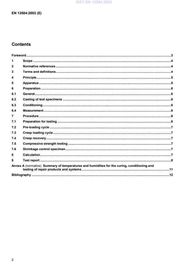 EN 13584:2003 is a standard published by the European Committee for Standardization (CEN). Its full title is "Products and systems for the protection and repair of concrete structures - Test methods - Determination of creep in compression for repair products". This standard covers: This European Standard specifies a method for measuring creep under compressive load in products and systems for the repair of concrete structures, as defined in prEN 1504-3.The method is suitable for repair mortars and concretes with polymer binders (PC) and repair grouts, mortars and concretes with hydraulic binders (CC) and polymer cement binders (PCC).