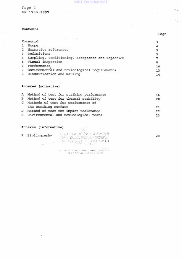2003-01.Slovenski inštitut za standardizacijo. Razmnoževanje celote ali delov tega standarda ni dovoljeno.Matches - Performance requirements, safety and classificationZündhölzer - Funktionsanforderungen, Sicherheit und KlassifikationAllumettes - Exigences de performance, sécurité et classificationMatches - Performance requirements, safety and classification97.180Razna oprema za dom in trgovinoMiscellaneous domestic and commercial equipmentICS:Ta slovenski standard je istoveten z:EN 1783:1997SIST EN 1783:2001en01-junij-2001SIST EN 1783:2001SLOVENSKI