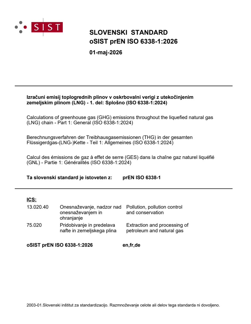Izračuni emisij toplogrednih plinov v oskrbovalni verigi z utekočinjenim zemeljskim plinom (LNG) - 1. del: Splošno (ISO 6338-1:2024)