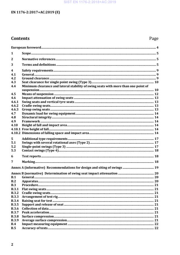EN 1176-2:2017+AC:2019 is a standard published by the European Committee for Standardization (CEN). Its full title is "Playground equipment and surfacing - Part 2: Additional specific safety requirements and test methods for swings". This standard covers: This European Standard specifies additional safety requirements for swings intended for permanent installation for use by children. Where the main play function is not swinging, the relevant requirements in this part of EN 1176 may be used, as appropriate. NOTE Recommendations on the design and siting of swings are given in Annex A.