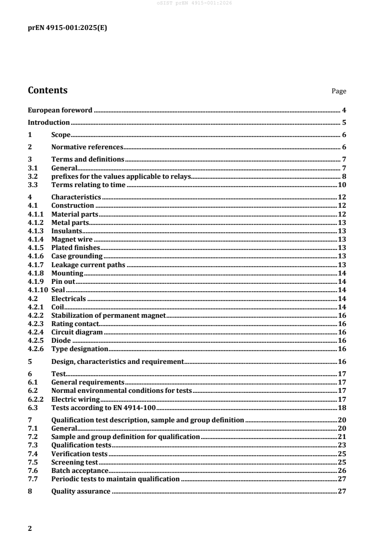 prEN 4915-001 defines the technical specification for hermetically sealed, non-latching electromagnetic relays in the aerospace series. It applies to 2PDT, 4PDT and 6PDT relay configurations intended for continuous use across a temperature range of -55 °C to 125 °C. The document sets out general characteristics, qualification and acceptance conditions, quality assurance provisions and the required test programs and groups for aircraft use. These relays are compatible and interoperable with established military and industry families (for example, MIL‑PRF and CECC derivatives) and support contact ratings up to 25 A for low-level to power switching.