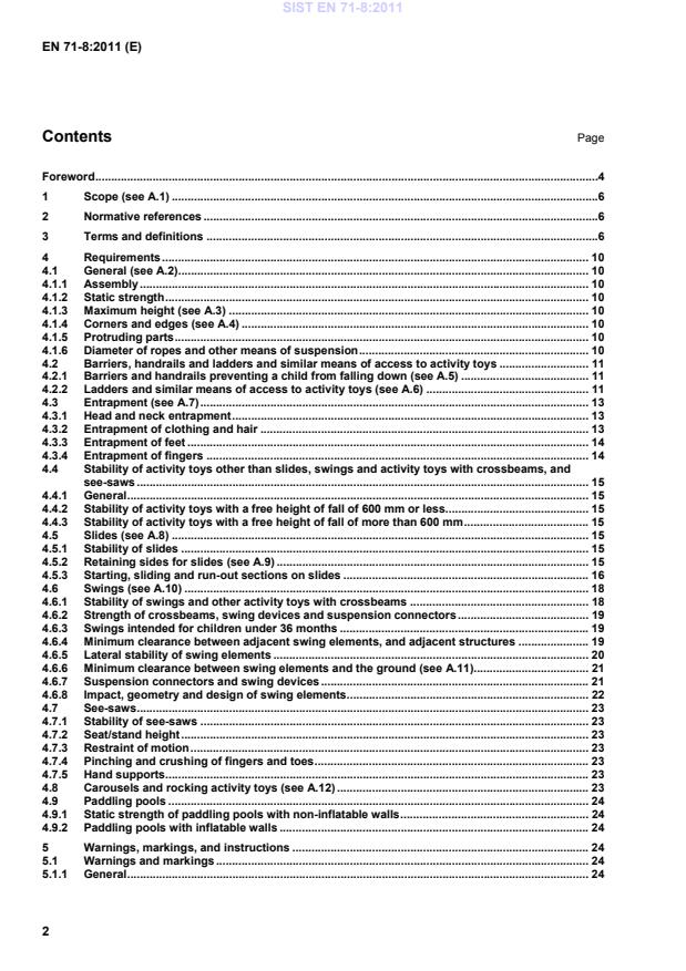 EN 71-8:2011 is a standard published by the European Committee for Standardization (CEN). Its full title is "Safety of toys - Part 8: Activity toys for domestic use". This standard covers: This European Standard specifies requirements and test methods for activity toys often attached to or incorporating a crossbeam, and similar toys intended for children under 14 years to play on or in and often intended to bear the mass of one or more children. This European Standard also specifies requirements for: - separately sold accessories for, and components of activity toys; - separately sold swing elements that are ready for use on or in combination with an activity toy; - construction packages for activity toys including components used to build activity toys according to a scheduled building instruction. The scope of this European Standard excludes: - playground equipment intended for public use dealt with in EN 1176; - bow-mounted rocking activity toys such as rocking horses and similar toys are covered by specific requirements in EN 71-1; - toy pools with maximum depth of water over 400 mm measured, between the overflow level and the deepest point within the pool; - toy trampolines. NOTE 1 Requirements for toy trampolines and non-aquatic inflatable toys are being elaborated. NOTE 2 There is an enhanced risk of drowning in toy pools where the depth of water is in excess of 400 mm.