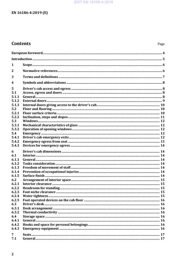 Ta evropski standard določa pravila oblikovanja in smernice za zagotovitev ustreznega dostopa do voznikove kabine, razsvetljave v njej, sedeža in izstopa iz nje. Različne dimenzije temeljijo na antropometričnih podatkih, opredeljenih v standardu EN 16186-1. V ta standard so vključene tudi ustrezne metode ocenjevanja. Zajema naslednje vidike: