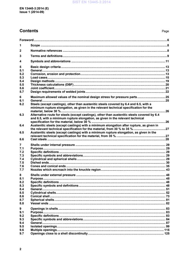 Issue 1 (2014-09) 9 EN 13445-2:2014, Unfired pressure vessels — Part 2: Materials EN 13445-4:2014, Unfired pressure vessels — Part 4: Fabrication EN 13445-5:2014, Unfired pressure vessels — Part 5: Inspection and testing EN 13445-8:2014, Unfired pressure vessels — Part 8: Additional requirements for pressure vessels of aluminium and aluminium alloys EN ISO 4014:2011, Hexagon head bolts — Product grades A and B (ISO 4014:2011) EN ISO 4016:2011, Hexagon head bolts — Product grade C (ISO 4016:2011) EN ISO 15613:2004, Specification and qualification of welding procedures for metallic materials — Qualification based on pre-production welding test ISO 261:1998, ISO general purpose metric threads — General plan 3 Terms and definitions For the purposes of this Part of this European Standard, the terms and definitions given in EN 13445-1:2014, EN 13445-2:2014 and the following apply: NOTE EN 13445-1:2014 and EN 13445-2:2014 have adopted terminology, symbols and definitions of EN 764-1:2004, EN 764-2:2012 and EN 764-3:2002. 3.1 action imposed thermo-mechanical influence which causes stress and/or strain in a structure, e.g. an imposed pressure, force, temperature 3.2 analysis thickness effective thickness available to resist the loading depending on the load case, see 5.3.2 3.3 assumed thickness thickness assumed by the designer between the minimum required shell thickness e and the shell analysis thickness ea 3.4 calculation pressure differential pressure used for the purpose of the design calculations for a component [EN 764-1:2004] 3.5 calculation temperature temperature used for the purpose of the design calculations for a component [EN 764-1:2004] 3.6 chamber fluid space within a unit of pressure equipment [EN 764-1:2004] 3.7 component part of pressure equipment which can be considered as an individual item for the calculation [EN 764-1:2004] SIST EN 13445-3:2014