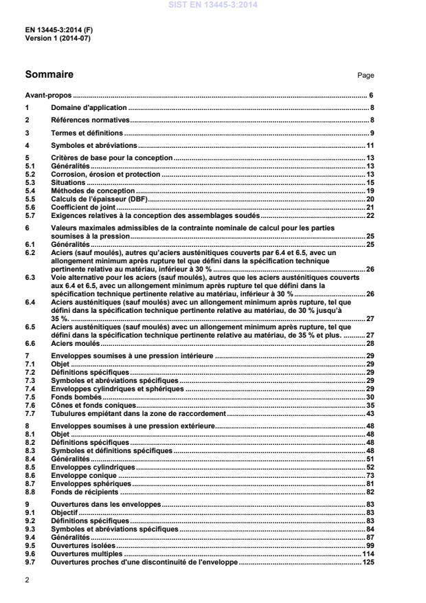 .................................................................................... 522 19 Conception dans le domaine de fluage ............................................................................................525 19.1 Objet .....................................................................................................................................................525 19.2 Définitions spécifiques ......................................................................................................................525 19.3 Symboles et abréviations spécifiques .............................................................................................525 19.4 Calcul dans le domaine de fluage .....................................................................................................526 19.5 Contrainte nominale de calcul dans le domaine de fluage ............................................................526 19.6 Coefficient de joint dans le domaine de fluage ...............................................................................531 19.7 Chargement dû à la pression à prédominance non cyclique dans le domaine de fluage ..........531 19.8 Procédures de calcul pour la conception par formules (DBF) ......................................................531 20 Règles de conception des parois planes renforcées .....................................................................535 20.1 Généralités ..........................................................................................................................................535 20.2 Parois planes entretoisées ................................................................................................................535 20.3 Définitions propres aux parois planes entretoisées .......................................................................535 20.4 Épaisseur requise des parois planes entretoisées .........................................................................535 20.5 Dimensions requises et configuration des entretoises boulonnées et des entretoises ............535 20.6 Exigences applicables aux entretoises boulonnées filetées .........................................................536 20.7 Exigences applicables aux entretoises boulonnées soudées et aux entretoises soudées .......536 20.8 Tableaux des parois planes entretoisées ........................................................................................537 20.9 Figures des parois planes entretoisées ...........................................................................................538 SIST EN 13445-3:2014