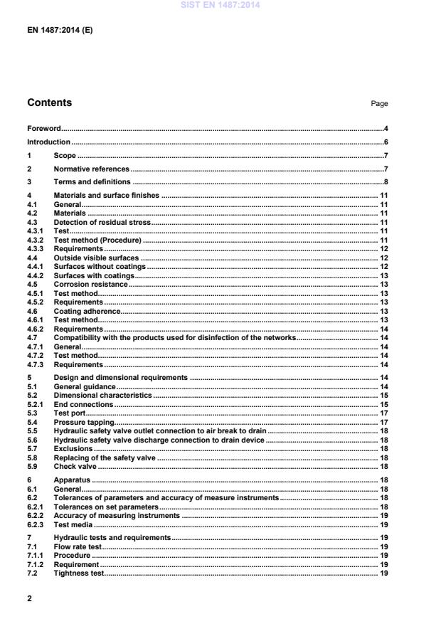 2 Contents Page Foreword .4 Introduction .6 1 Scope .7 2 Normative references .7 3 Terms and definitions .8 4 Materials and surface finishes . 11 4.1 General . 11 4.2 Materials . 11 4.3 Detection of residual stress . 11 4.3.1 Test . 11 4.3.2 Test method (Procedure) . 11 4.3.3 Requirements . 12 4.4 Outside visible surfaces . 12 4.4.1 Surfaces without coatings . 12 4.4.2 Surfaces with coatings . 13 4.5 Corrosion resistance . 13 4.5.1 Test method . 13 4.5.2 Requirements . 13 4.6 Coating adherence. 13 4.6.1 Test method . 13 4.6.2 Requirements . 14 4.7 Compatibility with the products used for disinfection of the networks . 14 4.7.1 General . 14 4.7.2 Test method . 14 4.7.3 Requirements . 14 5 Design and dimensional requirements . 14 5.1 General guidance . 14 5.2 Dimensional characteristics . 15 5.2.1 End connections . 15 5.3 Test port . 17 5.4 Pressure tapping. 17 5.5 Hydraulic safety valve outlet connection to air break to drain . 18 5.6 Hydraulic safety valve discharge connection to drain device . 18 5.7 Exclusions . 18 5.8 Replacing of the safety valve . 18 5.9 Check valve . 18 6 Apparatus . 18 6.1 General . 18 6.2 Tolerances of parameters and accuracy of measure instruments . 18 6.2.1 Tolerances on set parameters . 18 6.2.2 Accuracy of measuring instruments . 19 6.2.3 Test media . 19 7 Hydraulic tests and requirements . 19 7.1 Flow rate test . 19 7.1.1 Procedure . 19 7.1.2 Requirement . 19 7.2 Tightness test . 19 SIST EN 1487:2014
