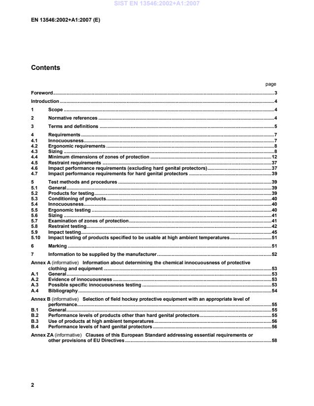 normal underclothing to be worn 3.3.2 chest girth maximum horizontal girth measured during normal breathing with the subject standing upright and the tape-measure passed over the scapulae under the armpits and across the chest 3.3.3 stature (Height) vertical distance between the crown of the head and the ground, measured with the subject standing upright without shoes and with their feet together 3.3.4 total crotch length lower trunk length. Length measured from the centre of the front of the waist as defined above through the crotch to the side of the genitalia, to the centre of the back of the waist 3.3.5 under bust girth horizontal girth of the body immediately below the breasts measured as for the bust girth 3.3.6 waist girth maximum horizontal girth measured during normal breathing with the subject standing upright and the tape-measure passed around the body in the plane of the waist, 50 mm above the supra-cristal plane which is at the level of the highest points of the iliac crests. The dimension of 50 mm refers to a subject of 178 cm tall and should be scaled pro rata with the height of the actual subject 3.3.7 waist to waist over the shoulder length maximum length measured from the plane of the waist, as defined above, over the shoulder to the plane of the waist. The tape-measure crosses the shoulder at the mid point between the point of the shoulder and the junction of the shoulder to the neck. Anteriorly the tape measure passes over the chest (or bust) to a point 90 mm lateral to the midline of the body on the plane of the waist. Posteriorly the tape measure follows the shortest distance to a point 90 mm lateral to the midline of the body. The distances of 90 mm refer to a subject with a waist girth of 85 cm and should be scaled pro rata with the waist girth of the actual subject. Normal underclothing to be worn for the measurement 4 Requirements 4.1 Innocuousness Protective clothing and equipment for field hockey players shall meet a general requirement that the product is safe to use and fit for its purpose. It shall be designed and manufactured to provide protection when used according to the manufacturer’s instructions, without endangering the user or other players. There shall not be hard or sharp edges, seams, buckles or other items on the surfaces of the products that could harm the user or other players during normal use. Examination shall be made according to 5.4. Construction materials and incorporated substances, shall not harm those coming into contact with them. The manufacturer shall list in the Information supplied with the product, the substances used in the main components of the product, and shall label any product containing substances or preparations generally known to be hazardous. SIST EN 13546:2002+A1:2007