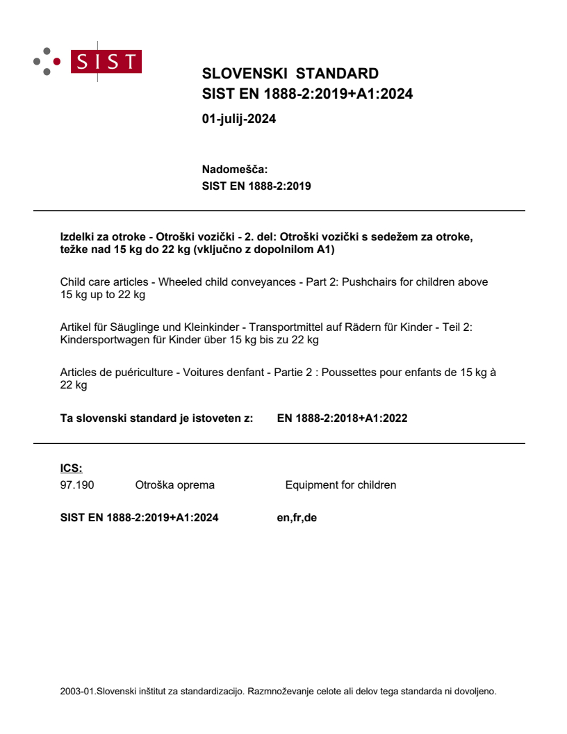 Izdelki za otroke - Otroški vozički - 2. del: Otroški vozički s sedežem za otroke, težke nad 15 kg do 22 kg (vključno z dopolnilom A1)