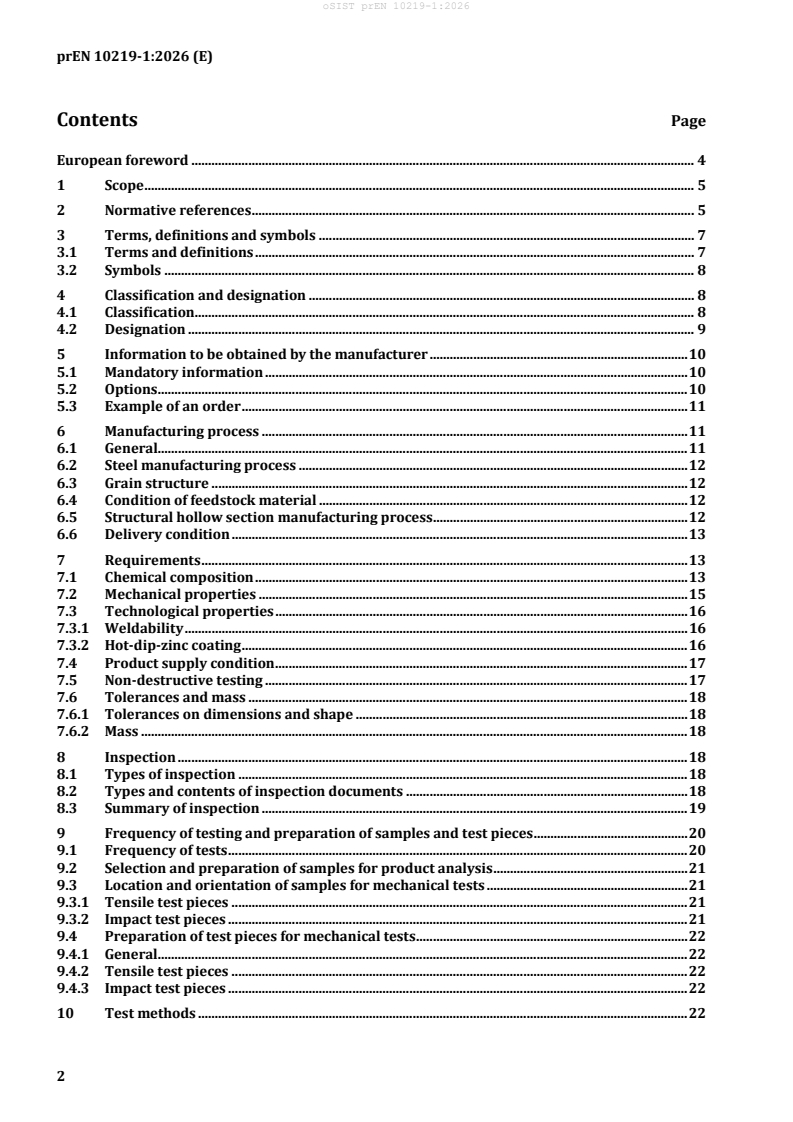 prEN 10219-1:2026, issued by CEN, defines the technical delivery conditions for cold formed welded steel structural hollow sections. This standard applies to hollow sections produced by electric welding or submerged arc welding and shaped cold, without any subsequent heat treatment except for the weld seam. The specification addresses various hollow section forms-including circular, square, rectangular, and elliptical-commonly used in construction and engineering industries.