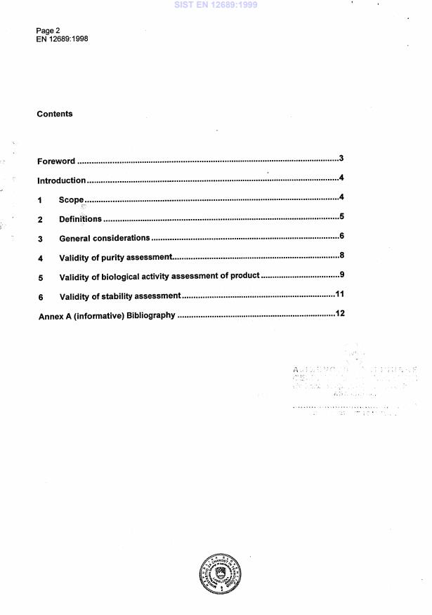 EN 12689:1998 is a standard published by the European Committee for Standardization (CEN). Its full title is "Biotechnology - Guidance on assessment of the purity, biological activity and stability of microorganism based products". This standard covers: This European Standard gives guidance on assessment of technical specifications of microorganism based products (MBPs) for product quality evaluation. It is also applicable for purposes of product registration. NOTE 1: In this European Standard, the technical specifications are considered to be purity, biological activity and stability of microorganism based product. This European Standard describes criteria and factors considered for the validity of the assessment of the technical specifications.