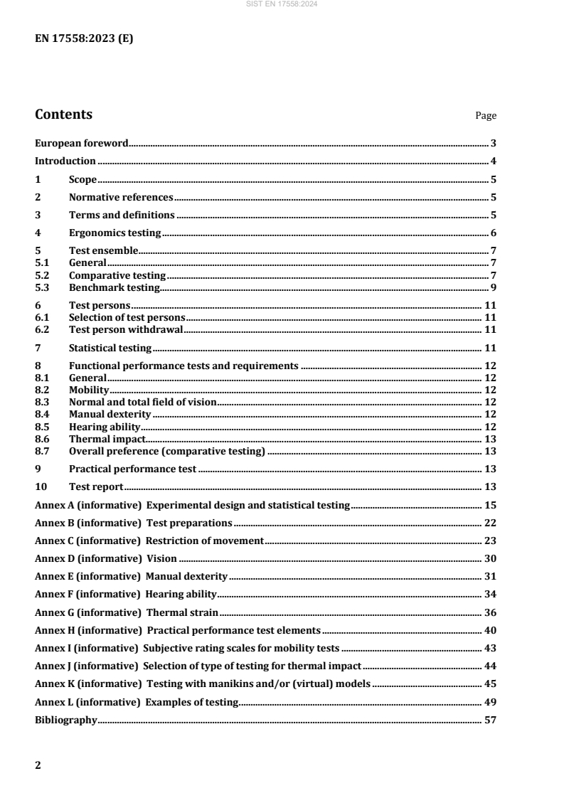 The standard EN 17558:2023, titled "Ergonomics - Ergonomics of PPE ensembles," offers a comprehensive framework for evaluating the performance of personal protective equipment (PPE) ensembles through standardized testing methods. Its primary scope revolves around providing relevant procedures for comparing various PPE ensembles during the selection process without replacing the certification standards for individual PPE items. One of the significant strengths of this standard is its emphasis on understanding the interactions among individual items of PPE within an ensemble. This approach allows for the identification of any potential adverse effects that may occur due to the combination of different PPE items, the user, and the surrounding environment. This holistic evaluation is crucial for ensuring the safety and comfort of users in various operational scenarios. Moreover, EN 17558:2023 delineates two fundamental testing methodologies: benchmark testing, which evaluates a PPE ensemble against established conditions, and comparative testing, which allows for direct performance comparisons among multiple PPE ensembles. This versatility aids users in making informed decisions tailored to specific use cases, thereby enhancing the overall effectiveness of PPE selection. The inclusion of both laboratory and field test examples further enriches the standard's practical applicability, offering a robust resource for assessing ergonomic performance. This standard is particularly beneficial for assessing newly integrated PPE items within an ensemble, as it facilitates customized test batteries specific to the user's needs and context. Overall, EN 17558:2023 stands out as a pertinent and necessary document that addresses an often-overlooked aspect of PPE - the ergonomics of ensembles. Its structured approach to testing not only promotes safety and functionality but also underscores the importance of ergonomic considerations in the effective deployment of personal protective equipment.