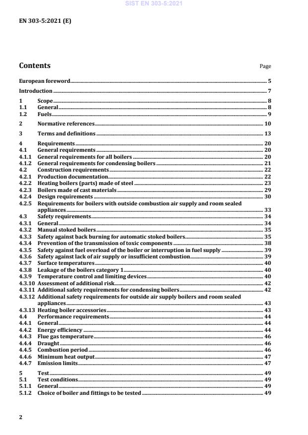 EN 303-5:2021 is a standard published by the European Committee for Standardization (CEN). Its full title is "Heating boilers - Part 5: Heating boilers for solid fuels, manually and automatically stoked, nominal heat output of up to 500 kW - Terminology, requirements, testing and marking". This standard covers: 1.1 General This European Standard applies to heating boilers including safety devices up to a nominal heat output of 500 kW which are designed for the burning of solid fuels only and are operated according to the instructions of the boiler manufacturer. This European Standard deals with significant hazards, hazardous situations and events relevant to heating boilers used as intended and under the conditions foreseen by the manufacturer (see Clause 4). The boilers may operate under natural draught or forced draught. The stoking may work manually or automatically. The boilers may operate under room sealed conditions in case of supervised under pressure in the combustion chamber. The boilers may operate in condensing condition. NOTE This European Standard deals with boilers which are both within and outside of the scope of the Machinery Directive 2006/42/EC. This European Standard contains requirements and test methods for safety, combustion quality, operating characteristics, marking and maintenance of heating boilers and secondary emission reduction appliances and efficiency improvement appliances. It also covers all external equipment that influences the safety systems (e.g. back burning safety device, integral fuel hopper). This European Standard covers only boilers that include burners as a unit. The standard applies to the combination of a boiler body with a solid fuel burner according to EN 15270 as a unit only when the whole unit is tested in accordance with this European Standard. Heating boilers in accordance with this European Standard are designed for central heating installations where the heat carrier is water and the maximum allowable temperature is 110 °C, and which can operate at a maximum allowable operating pressure of 6 bars. For heating boilers with a built-in or attached water heater (storage or continuous flow heater), this European Standard only applies to those parts of the water heater which are necessarily subject to the operating conditions of the heating boiler (heating part). This European Standard does not apply to: heating boilers and other heating appliances which are also designed for the direct heating of the place of installation; cooking appliances; the design and construction of external fuel storage and transportation devices prior to the safety devices of the boiler; room sealed applications above a nominal heat output > 70 kW or operated with positive pressure in the combustion chamber or operated under natural draught; This European Standard specifies the necessary terminology for solid fuel heating boilers, the control and safety related requirements, the design requirements, the technical heating requirements (taking into account the environmental requirements) and testing, as well as the marking requirements. This European Standard is not applicable to heating boilers which are tested before the date of its publication as an EN (European Standard). 1.2 Fuels These boilers may burn either fossil fuels, biogenic fuels or other fuels such as peat, as specified for their use by the boiler manufacturer, in accordance with the requirements of this European Standard. Solid fuels included in this European Standard are categorised as follows. 1.2.1 Biogenic fuels Biomass in a natural state, in the form of: Adaptation to new fuels standards and consideration of new fuels standards in preparation. A log wood with moisture content w ≤ 25 %, according to EN 14961-5; B1 chipped wood (wood chipped by machine, usually up to a maximum length of 15 cm) with moisture content from w 15 % to w 35 %, according to EN 14961-4; B2 chipped wood as under B1, except with moisture content w > 35 %; C1 compressed wood (e.g. pellets without additives, made of wood and/or bark particles; natural binding agents such as molasses, vegetable paraffins and starch are permitted), pellets according to EN 14961-2; (...)
