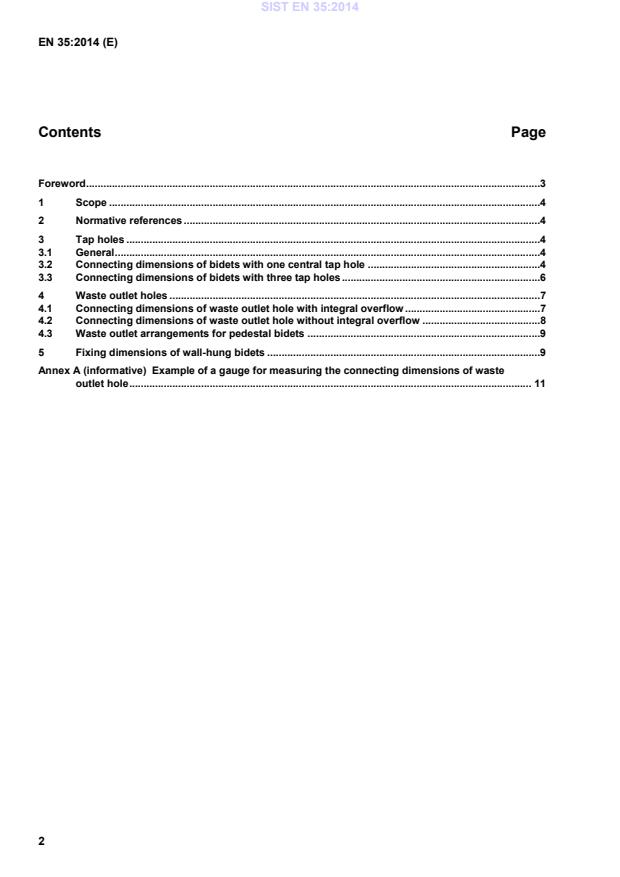 Foreword .3 1 Scope .4 2 Normative references .4 3 Tap holes .4 3.1 General .4 3.2 Connecting dimensions of bidets with one central tap hole .4 3.3 Connecting dimensions of bidets with three tap holes .6 4 Waste outlet holes .7 4.1 Connecting dimensions of waste outlet hole with integral overflow .7 4.2 Connecting dimensions of waste outlet hole without integral overflow .8 4.3 Waste outlet arrangements for pedestal bidets .9 5 Fixing dimensions of wall-hung bidets .9 Annex A (informative)