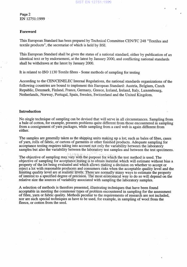 EN 12751:1999 - Textiles: Sampling of fibres, yarns and fabrics for testing is a European (CEN) standard that specifies methods for preparing laboratory samples of fibres, yarns and textile fabrics. The standard describes the principle of each sampling method at the start of the relevant clause and provides a limited treatment of the related problem of drawing test specimens. EN 12751:1999 clarifies how to prepare representative samples for subsequent laboratory testing, while recognizing that specific sample selection is often governed by the relevant test method.